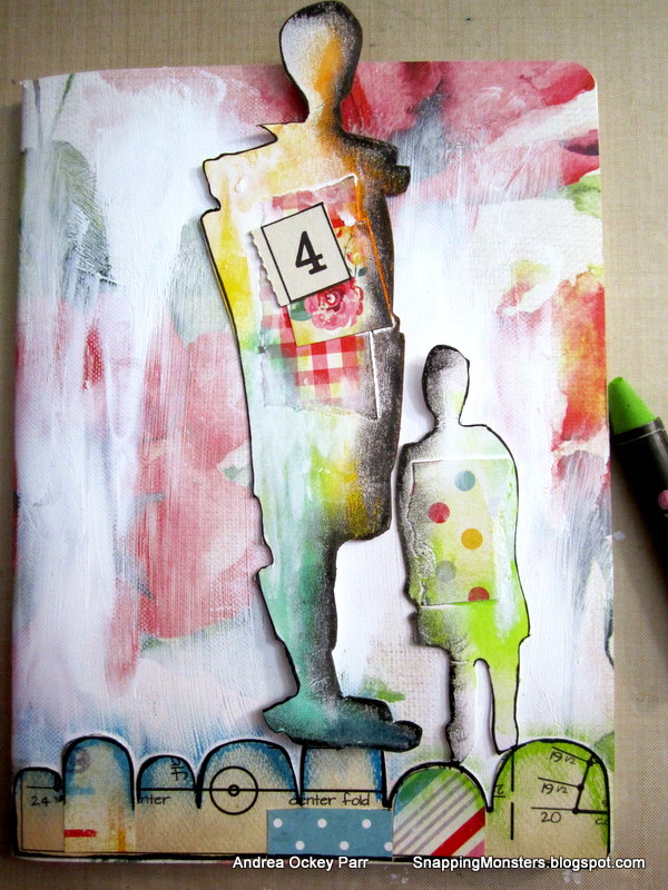 I started this project with a floral notebook, which I coated with Gesso and then white paint. While that was drying, I traced two of the funky stencil silhouettes and cut them out of Strathmore Mixed Media paper. There are two of these funky silhouette stencil sets- one with two "giant" silhouettes and the other with smaller silhouettes. I like the variety that having both sets offers. To give this scene the look of a parent and child, I used one of the giant silhouettes from the first set and paired it with one of the smaller silhouettes from the second set.