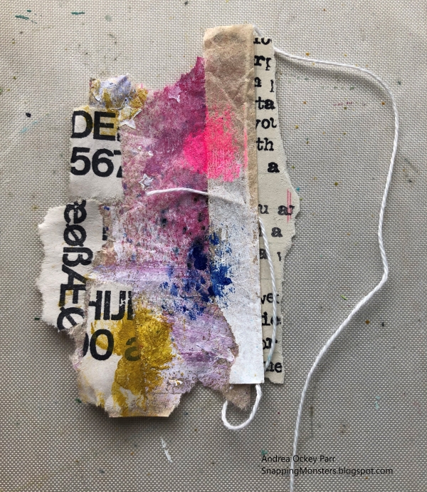 The person was crazy and the background was crazy, so I needed some sort of layer in between. I sewed together some scraps (including a tea bag that was also left over from a previous project). The text strips and bits were made with Tim Holtz's stamps. I glued all my layers together.