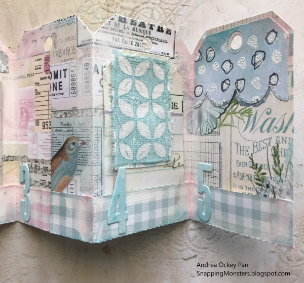 I assembled my tag elements, then decided it needed something to go across the bottom of the tag horizontally, so I cut a strip of paper using AALL & Create's Frayed Frames die set. I painted this thin little strip in shades of blue and black and added that across the bottom. I'd added a lot of watery stuff to the Kraft Distress Heavystock tag and it was getting pretty warped at this point, so I ended up cutting a second tag out of sturdy Strathmore Mixed Media paper and glued the Kraft tag to the Strathmore tag so it had more stability.